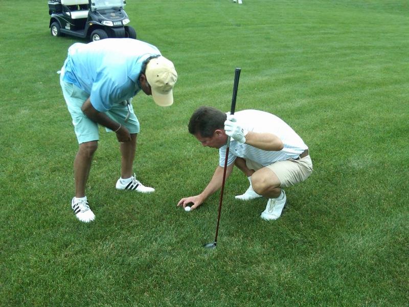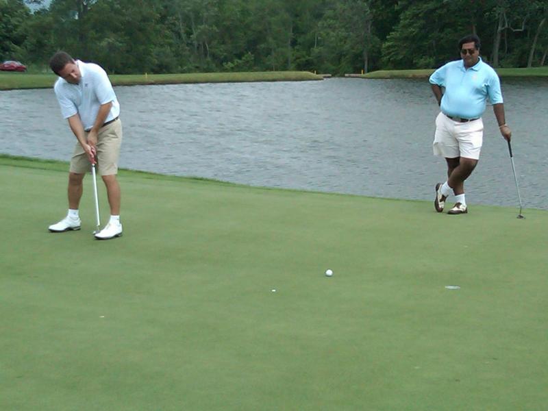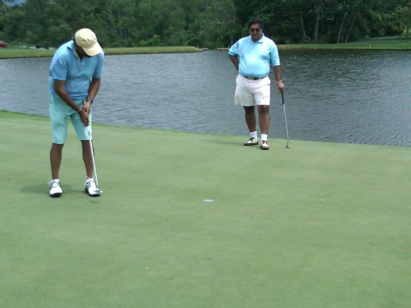 Ravi Akhoury drains a par putt on 18 to closeout the match. His partner Haresh looks on.
